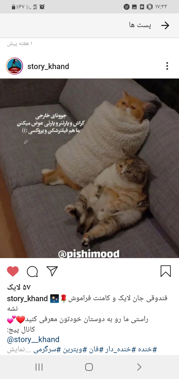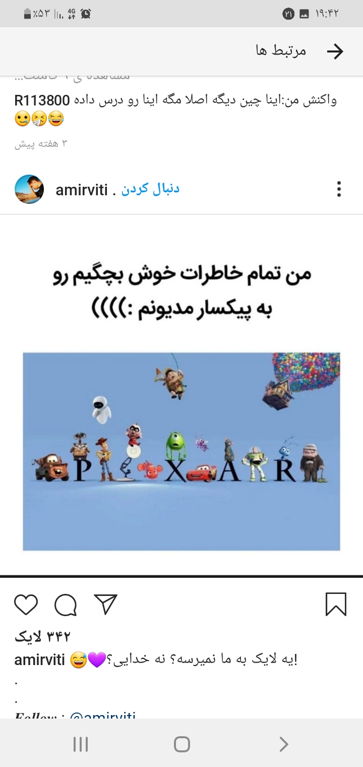 جنسیت مهم نیست نیاز به دلداری بود درخواست بدین/ما اصلا چیزی بنام جوان ایرانی نداریم، از ۱۵ سالگی زارت میوفتیم تو ۵۰ سالگی/منطقی نیستی ریپ نزن/تعصب داری رو دینت بازم ریپ نزن/کاربر خاموش بودم ب مدت ۲ سال/هرچه افسردهتر شوختر/یبار برا همیشه میگم، ازدواج یعنی شریک زندگی، و شریک زندگی یعنی کسی که باهاش زندگی میکنی نه کسی که به همچیت گیر میده/اگه دوستت داشته باشه همینجوری که هستی دوست داره و سعی نمیکنه تغییرت بده/سینگل به گورم با افتخار فراوون/دیش دارا دیم دارتا پیتام😐🚶🏻♂️