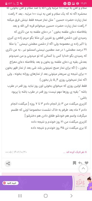 فقط یه چیزی اول بسم الله زیارت عاشورا و علقمه و معراج پشت سر رو نخون ( من کاربر آلتادین هم هستم در تاپیک اولم ( چله های باطل سحر و چله های بخت گشا دارم: بعد از چله های باطل سحر " یا وسطای چله " حرز امام جواد علیه السلام " هم کبیر هم صغیر " رو طبق مزاج اختری تهیه کن باید طبق مزاج اختری نوشته بشه تا اثر بزاره وگرنه اثر نمیزاره 《 یا اینکه اول حرز امام جواد علیه السلام " هم کبیر هم صغیر " رو تهیه کن ، و در روزی که قمر در عقرب " ایام نحس " نباشه چله های باطل سحر رو انجام بده و وسطای چله حرزی که طبق مزاج اختری هست رو ببند به بازوی راستت ( بازوبند) اگه بستن به بازو ممکن نیست بنداز گردنت ( گردنبند جا دعایی) در اون تاپیک در مورد مزاج اختری هست که زمان بستن حرز برای هر مزاجی در چند شنبه است
