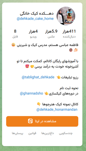 من داخل کانال هاش عضو هستم هم پیام رسان های ایرانی کانال دارن و هم اینستا و تلگرام و واتس اپ،گوگل سرچ کنید همه رو میاره من بیشتر از دستورهای کانالشون استفاده میکنم به نظرم هم خودشون با شخصیتن و هم آموزشا خیلی خوب بودن یکی از دوره هاشون هم شرکت کردم دوره کیک خامه رو واقعا راضی بودم راحت میتونم کیک خامه با تزئیناتی که دوس دارم درست کنم