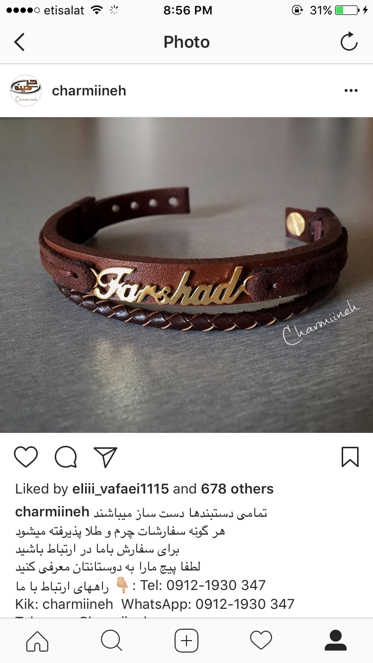 setarehjoon1 عضویت: 1393/01/02 تعداد پست: 4182 عزيزم تو اينستا اينو ديده بودم منم خوشم ارمد؛ اما يه پيج هس دستبند چرم ميسازه و مثلاحروف اسم رو با طلا روش كار ميكنه حدود دوبست سيصد هس قيمتش خيلي شيكع امه دوس داري ادرسش رو بزارم خدایا به من نی نی بده متشکرم!!!