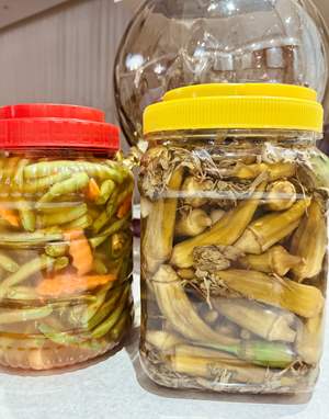 برعکس ترشی بامیه ام که این دفعه بامیه هام بزرگ بود (دفعه قبل ریز بودن ایندفعه درشت هستن حامد گیر داد نه درست میشه درست کن درست کردم واقعا هم شد تا درست میکنم حامد فرداش باز میکنه و قابل خوردن 🤣)بامیه ها رو ۱۵دقیقه داخل آب جوش میندازم میجوشه بعد شوک میدم در میارم داخل آب سرد مه داخلش یخ انداختم میندازم،سیر چند حبه درسته میندازم ،نعناع خشک و شوید خشک هم در چند مرحله موقع پر کردن داخل ظرف ترشی اضافه میکنم و فلفل سبز تند هم چند عدد از وسط نصف میکنم ،سرکه و آب نمک رو هم نصف نصف از هرکدوم اضافه میکنم هم میزنم بعد چیدن بامیه ها میریزم روشون