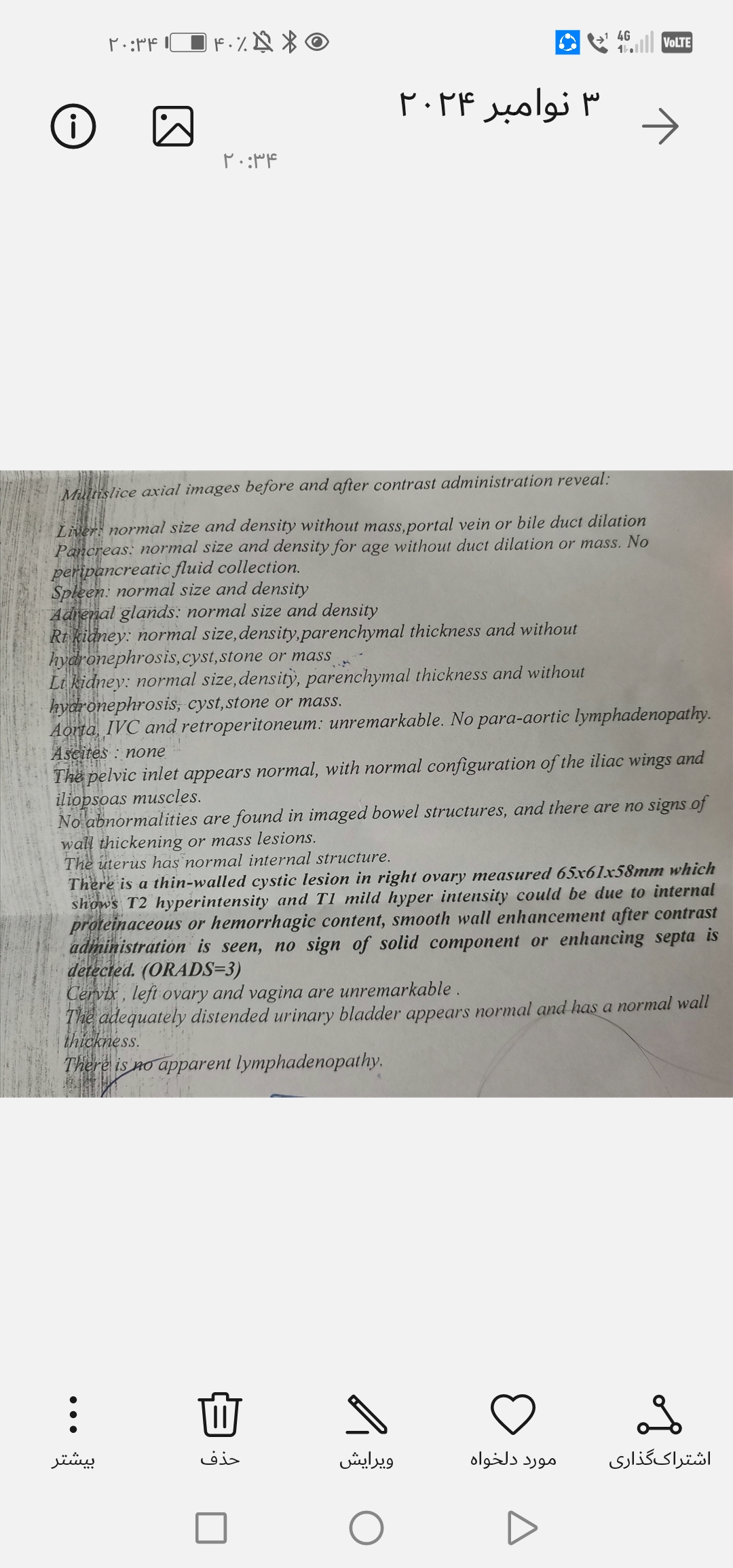 یک ضایعه کیستیک دیواره نازک در تخمدان راست به ابعاد 65x62x38 میلی متر وجود دارد که با شدت 12 می درخشد و T1 با شدت بیش از حد خفیف می تواند به دلیل محتوای پروتئینی داخلی یا خونریزی دهنده باشد، افزایش دیواره صاف پس از تجویز ماده حاجب مشاهده می شود، هیچ نشانه ای از جزء جامد یا افزایش سپتوم وجود ندارد.