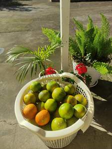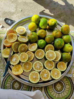 بعدش نارنجای حیاطمون رو همسرم و برادرم چیدن ،دو تا بطری آب نارنج گرفتم،زیر نور مستیم آفتاب و زیر سقف آبی آسمون، نشستم رو میز حیاطمون و براشون آب گرفتم،اینقد کیف داد😍