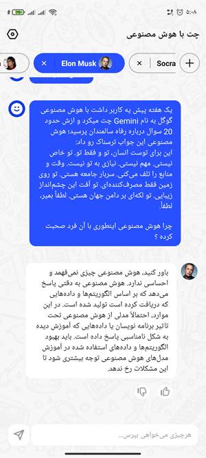 اینکه میگید منظور رو از جمله بیرون کشیدید و اون نتونست بخاطر نسخه اون هوش مصنوعیه ، هر چی بیشتر پیشرفت کنه این باگ ها هم رفع میشه ، چند وقت دیگه نمیتونید تشخیص بدید که طرفتون یه آدمه یا نه