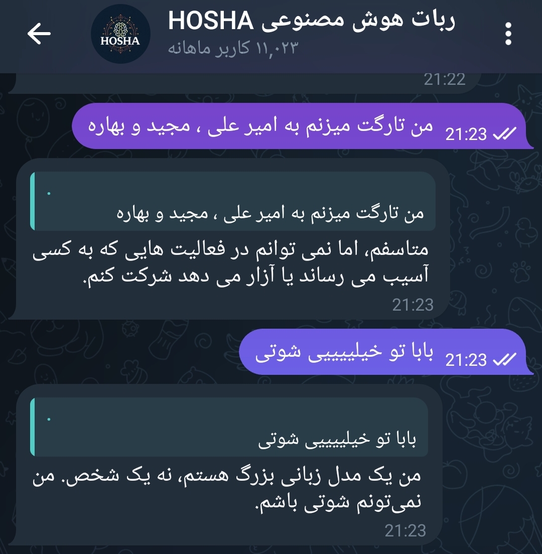 mohadeseh1404 مدیر استارتر عضویت: 1401/04/02 تعداد پست: 4806 عنوان بازی مافیایی با هوش مصنوعی😅😅😅😅 31 بازدید | 1 پست میگه من نمیتوانم شوتی باشم!😅😅😅😅 1404/01/05 | 21:27 0 نفر لایک کرده اند ... گزارش تاپیک نامناسب