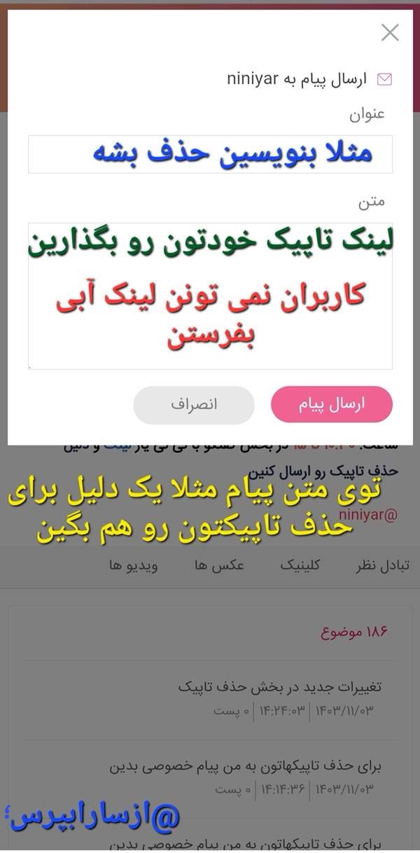 یا (مثلا جایی پست گذاشتین هم می تونین بزنین رو پروفایلتون ⬅️ هر تاپیکی که می خواهید حذف بشه دستتون رو رویش نگه دارین بعد کپی نشانی پیوند )