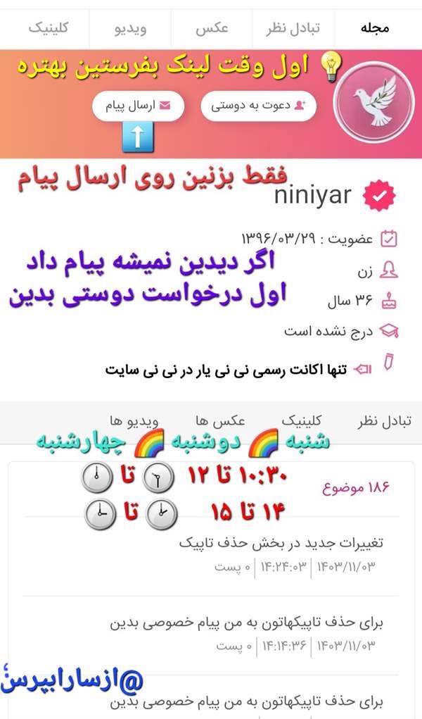 🟢 خصوصی لینک تاپیکتون رو برای niniyar روزهای زوج ⬅️ شنبه ها دوشنبه ها چهارشنبه ها ⬅️ بین ساعت های ۱۰:۳۰ تا ۱۲ 💚 و ۱۴ تا ۱۵ بفرستین.