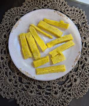 برش ها هر چقدر نازک تر باشن بهتره. اما من تپلی برش دادم که عااالی بود با این حال. ترد و پوک شد. داغ بخورید بهتره. مزه ی کوکو اصلا نمیده. وقت زیادی نمیگیره.