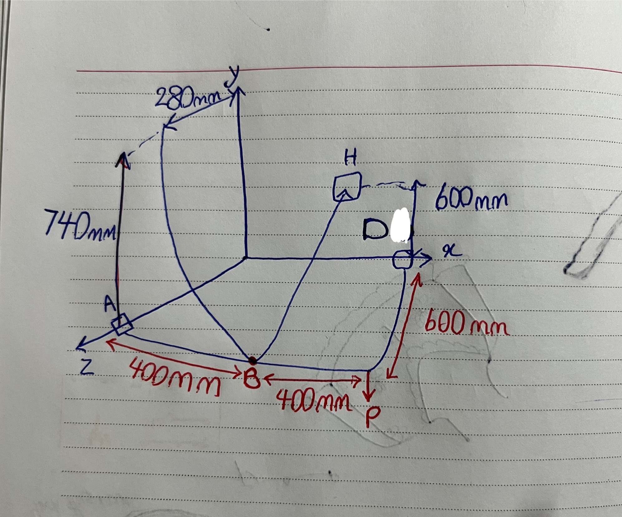 * **نقطه H:** (400 mm, 600 mm, 0) - فاصله H از محور X برابر 600mm و در صفحه XY قرار دارد. (این نقطه در شکل کمی بالاتر از D نشان داده شده، اما با توجه به خط چین و ابعاد 600mm، منطقیترین موقعیت در صفحه XY و در راستای X=400mm است).