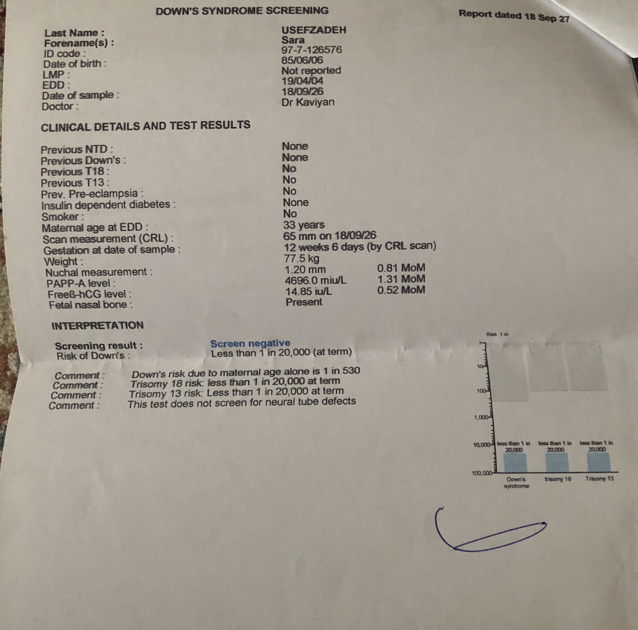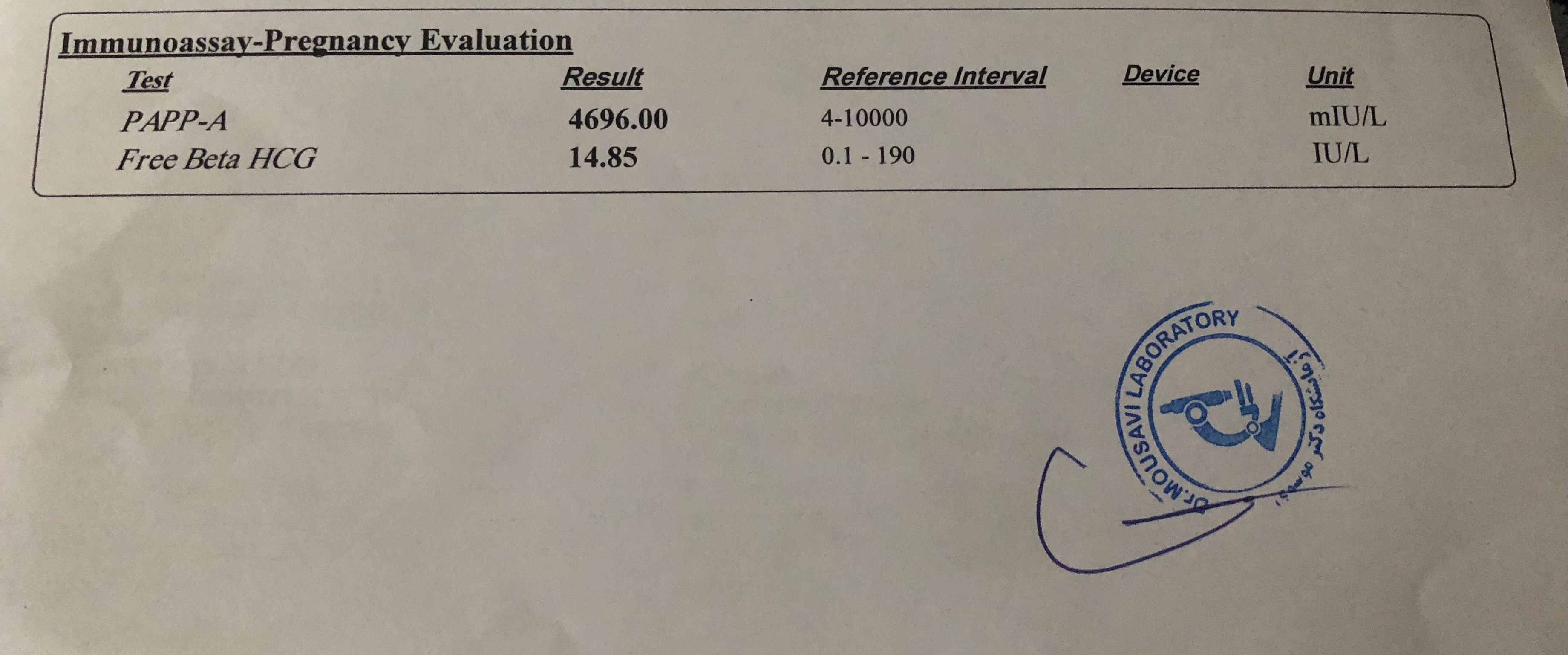 سلام ، ببخشید باز سوال دارم ، این آزمایشی که می فرستم مربوط به سه ماه اوله و سندرم داون رو ۱ در ۲۰ ه ...
