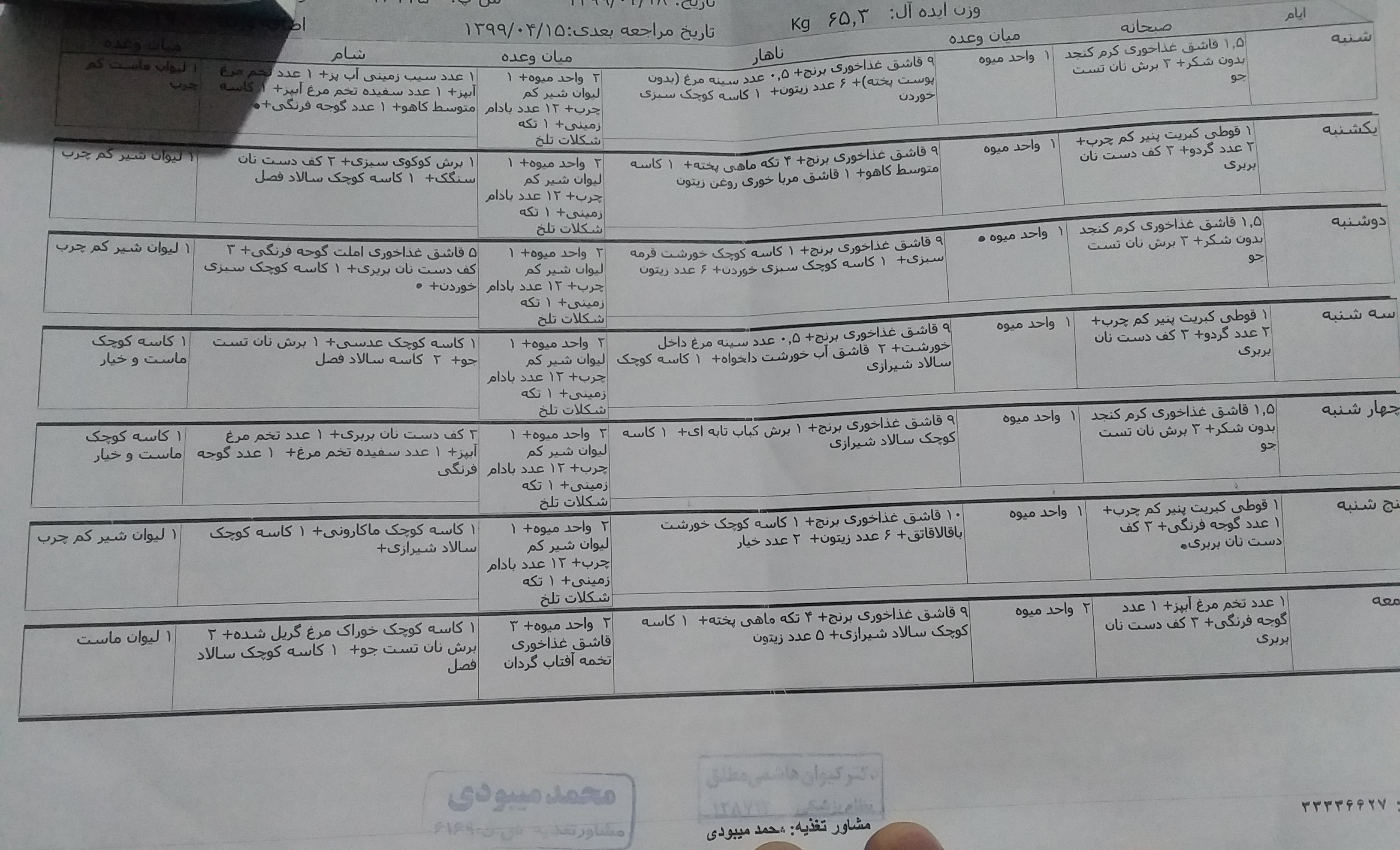خیلی زیاده خودم کمش کردم،صبحانه نون و کرم کنجد و پنیر و گردو و گوجه فرنگی و تخم مرغ اب پز البته هر کدومش یه روز جدا، میان وعده صبح میوه،ناهار ۹ق برنج با خورشتی که خودشون تعیین کردن،با سالاد یا زیتون،باز میان وعده بادام و شیر و شکلات تلخ ومیوه،شامم نون و ماکارانی و عدسی و...
