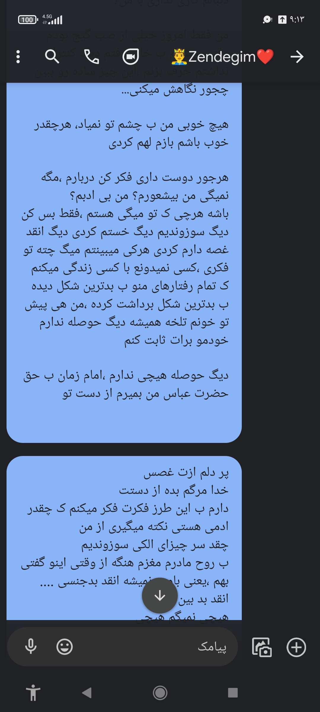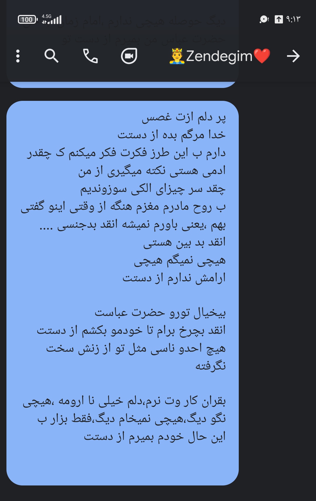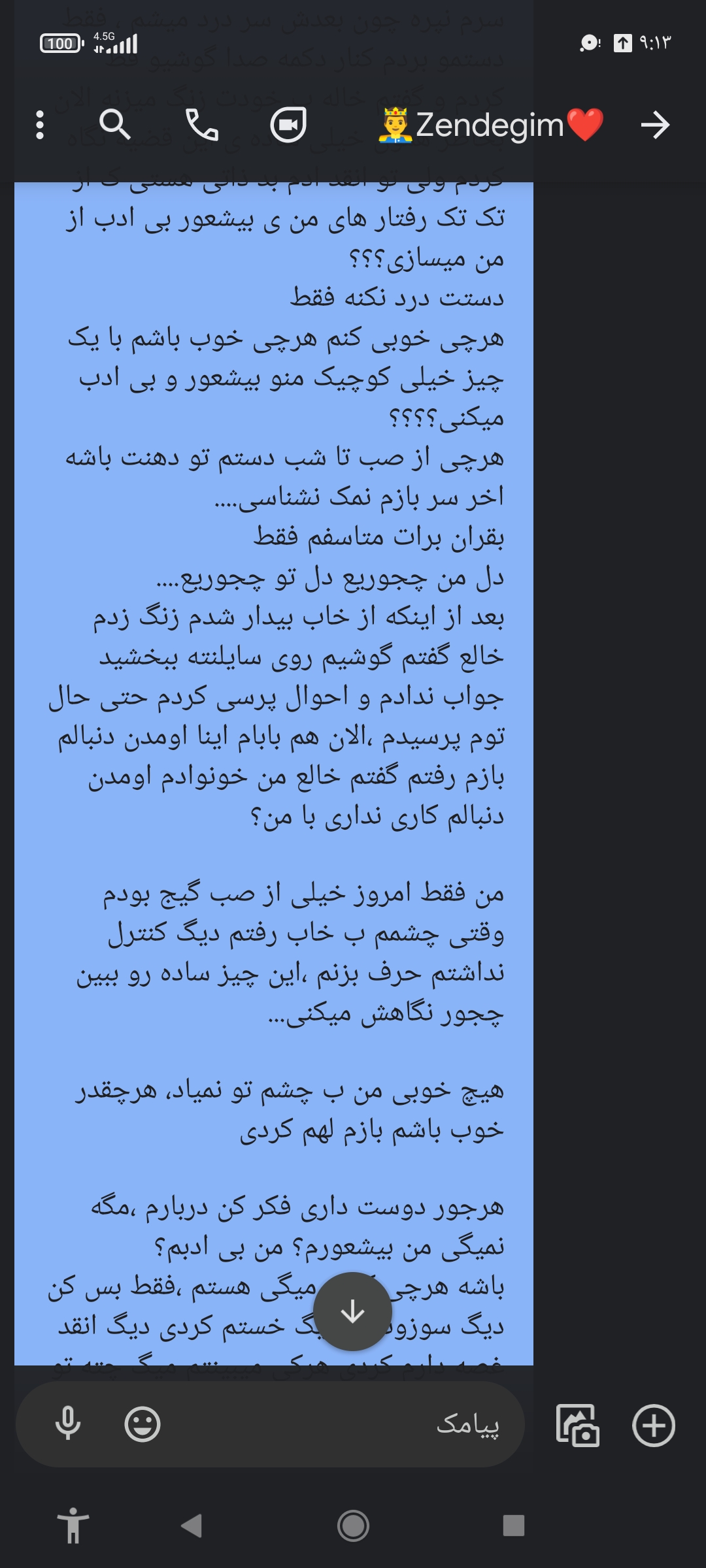 من همیشع ی صندلی واسم کم بود ،کتم واسم تنگ بود ، کفشام برام کوچیک بود،ساعتم خواب میموند و من ازش جلوتر حرکت میکردم .دنیا برا من جای کوچیکیع ،احساس میکنم همع جا بستس و نمیتونم نفس بکشم، انگار همع این لحظع هارو قبلا دیدم، درختا، صدای ابشار،قورباغه ها، اونارو زمانی میبینم ک در حال مردنم/